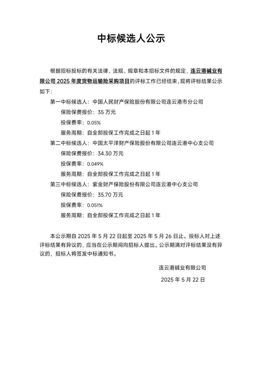 連云港堿業有限公司2025年度貨物運輸險采購項目中標候選人公示