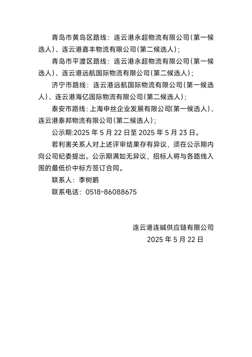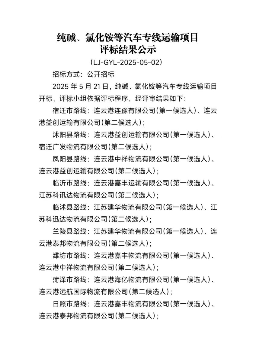 連云港連堿供應(yīng)鏈有限公司純堿、氯化銨等汽車專線運(yùn)輸項(xiàng)目評(píng)標(biāo)結(jié)果公示