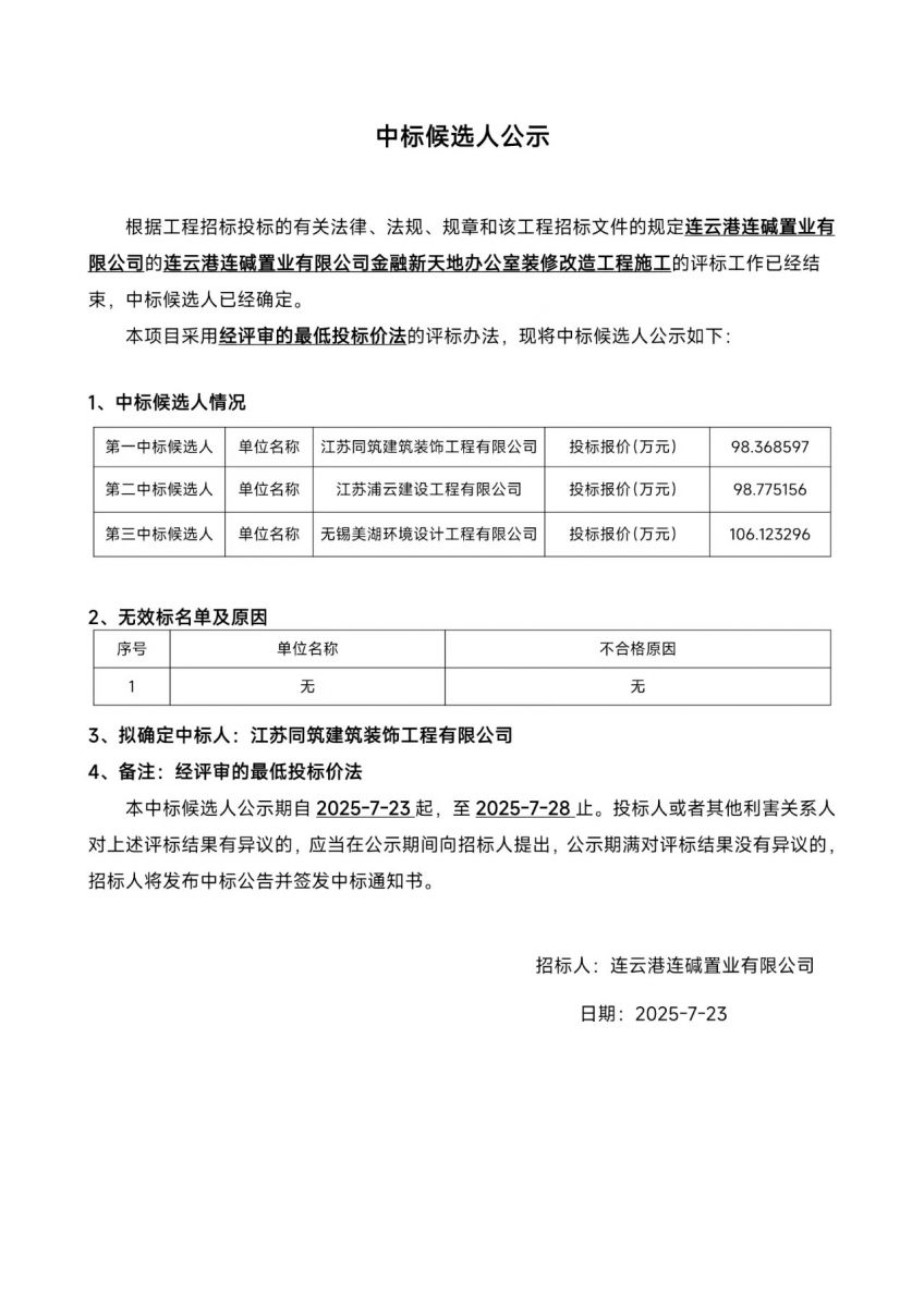 連云港連堿置業有限公司金融新天地辦公室裝修改造工程施工中標候選人公示