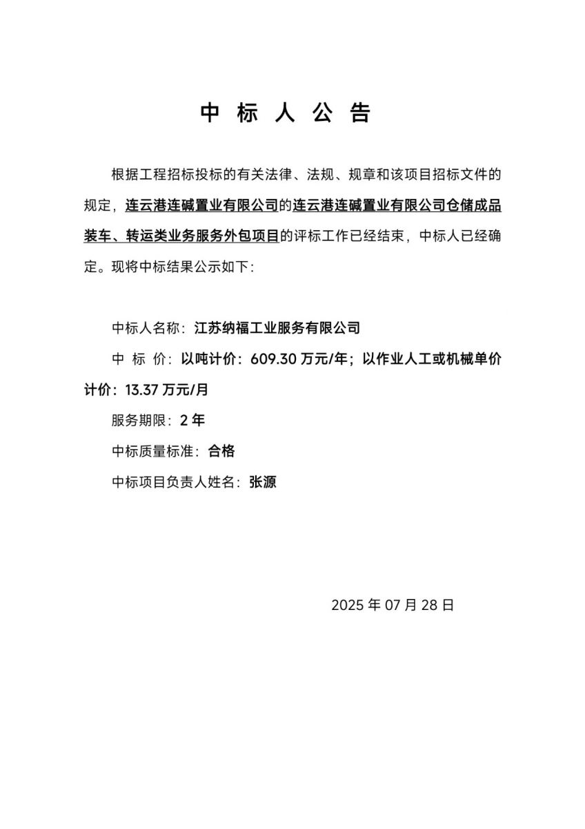 連云港連堿置業(yè)有限公司倉儲成品裝車、轉(zhuǎn)運類業(yè)務服務外包項目中標人公告
