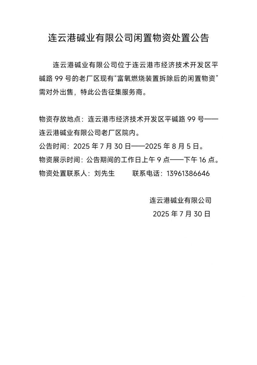 連云港堿業有限公司閑置物資處置公告