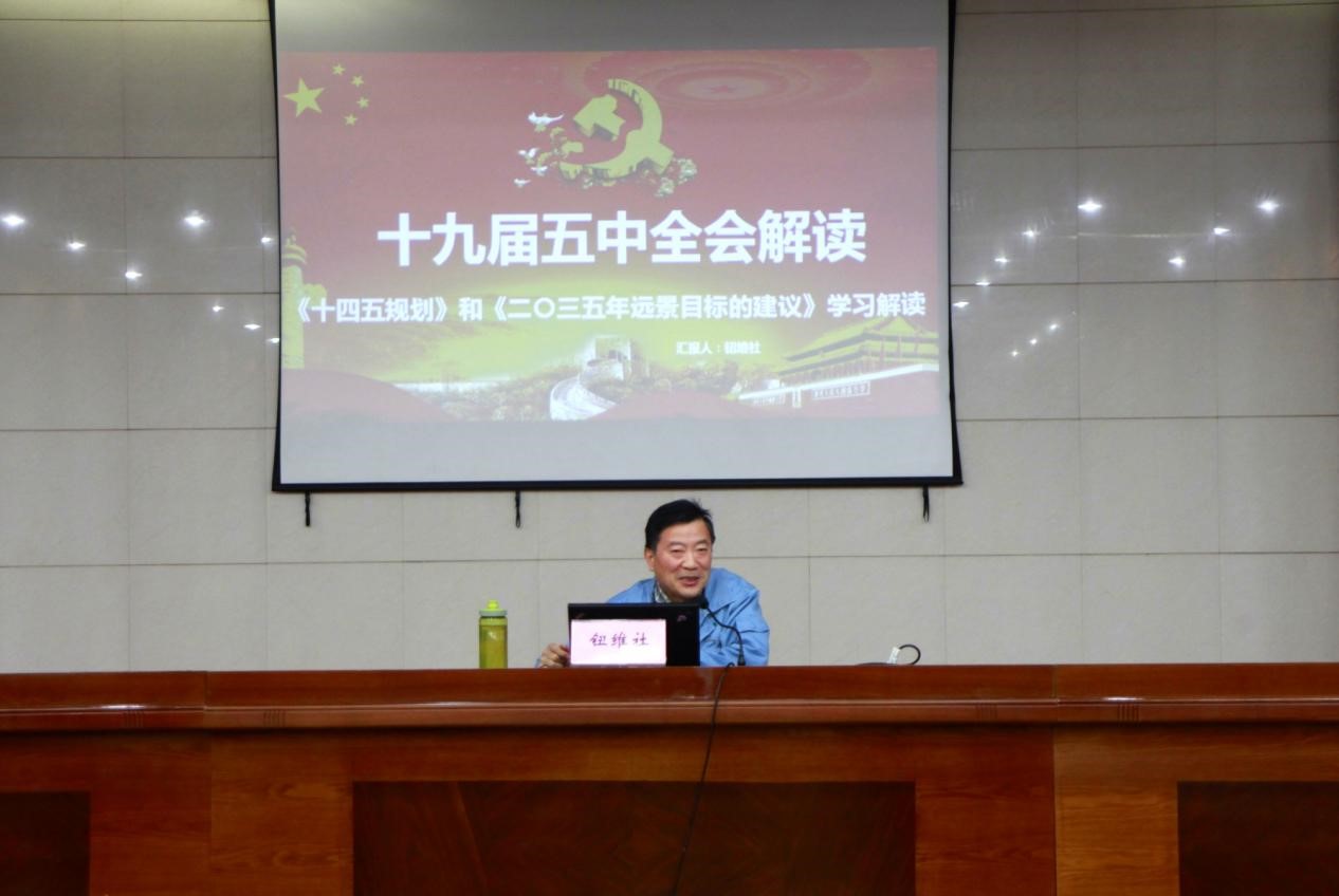 會上,鈕維社從“十九屆五中全會簡介”、“全會召開的背景和意義”、“回眸與展望”、“二0三五年遠景目標”、“十四五規劃”五個方面,結合具體事例,用通俗易懂的語言進行了全面準確的闡述,對我們認真領會、準確把握十九屆五中全會精神實質具有十分重要的意義。