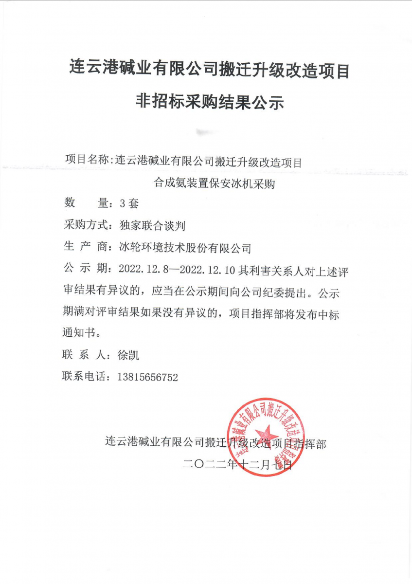 合成氨裝置保安冰機非招標采購結(jié)果公示