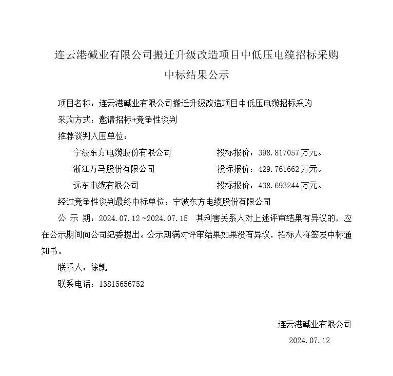 中低壓電纜中標招標采購中標結果公示