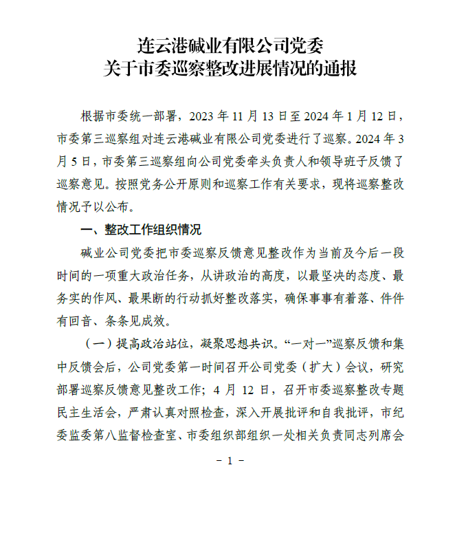 連云港堿業有限公司黨委關于市委巡察整改進展情況的通報