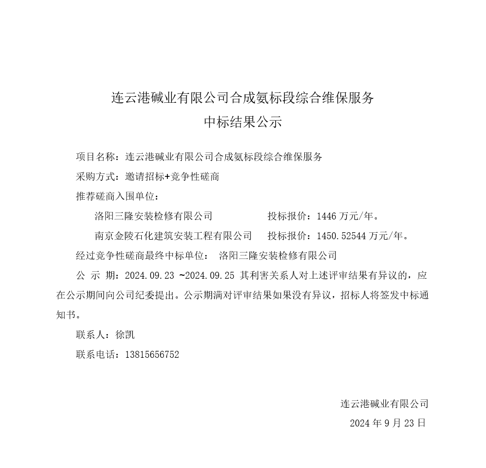 合成氨標(biāo)段綜合維保服務(wù)中標(biāo)結(jié)果公示