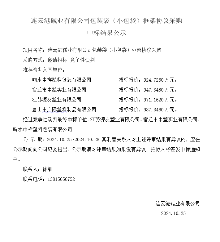 連云港堿業(yè)有限公司包裝袋(小包袋)框架協(xié)議采購中標結果公示