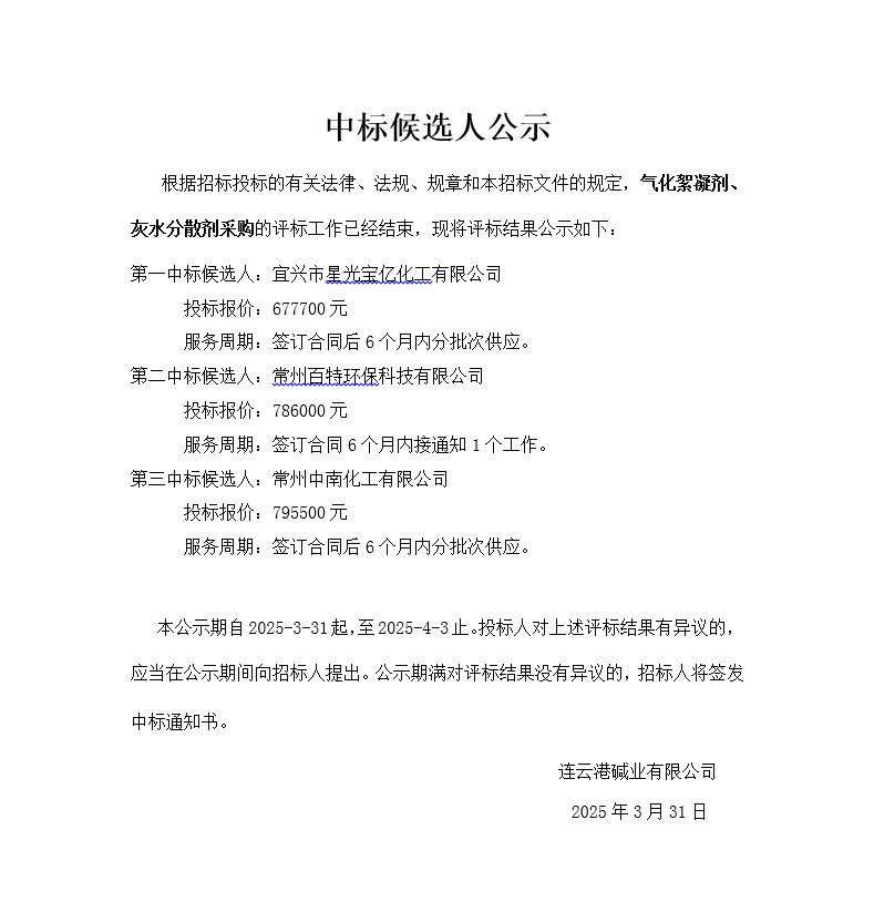 氣化絮凝劑、灰水分散劑采購中標候選人公示